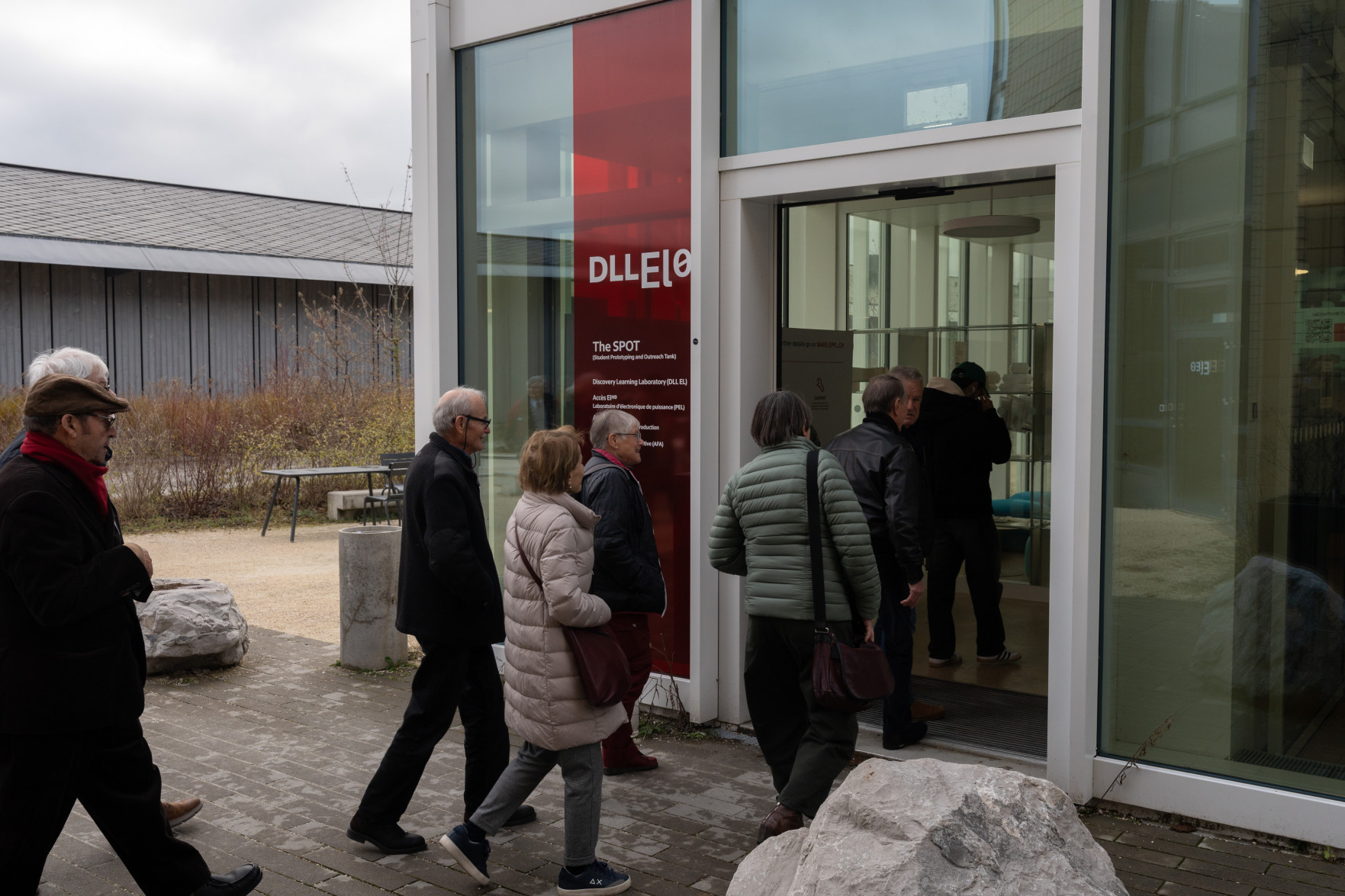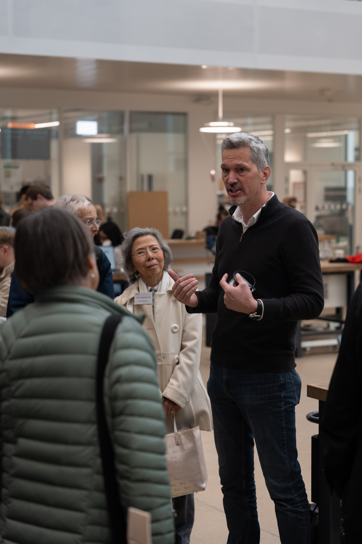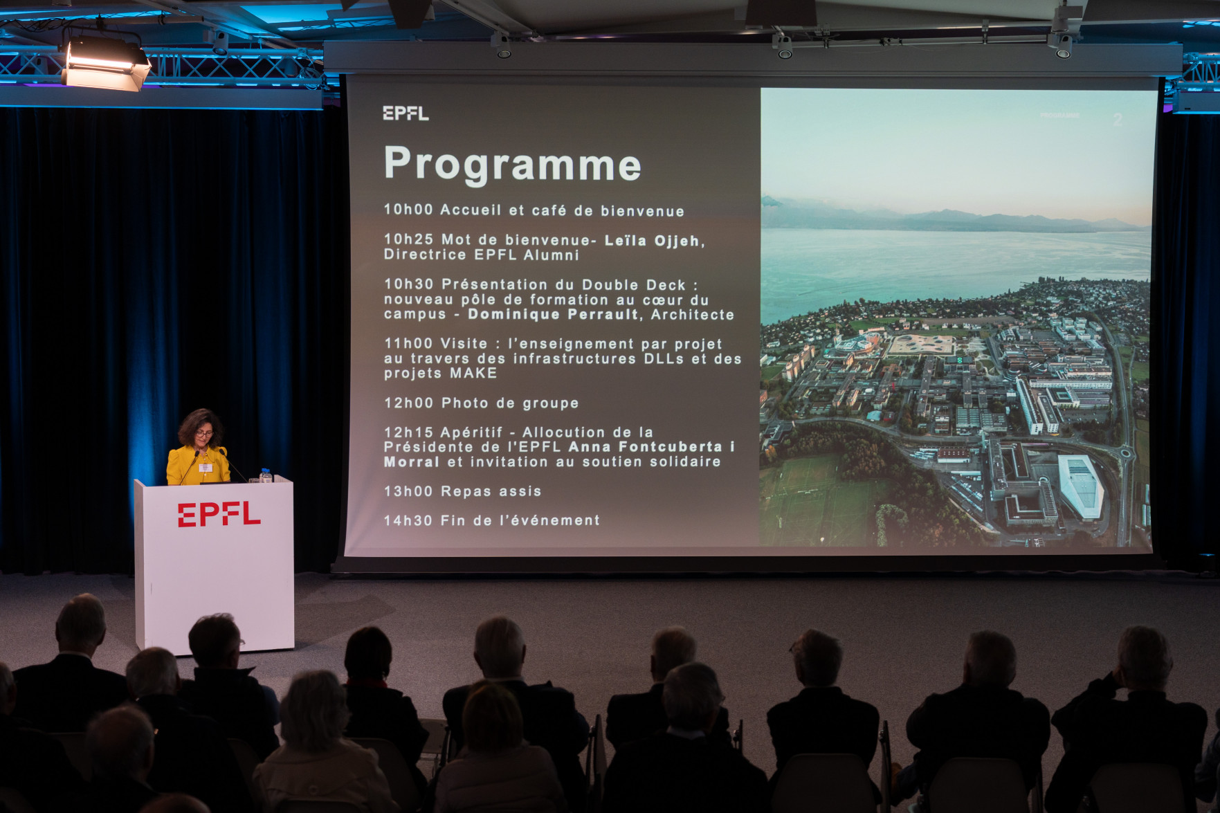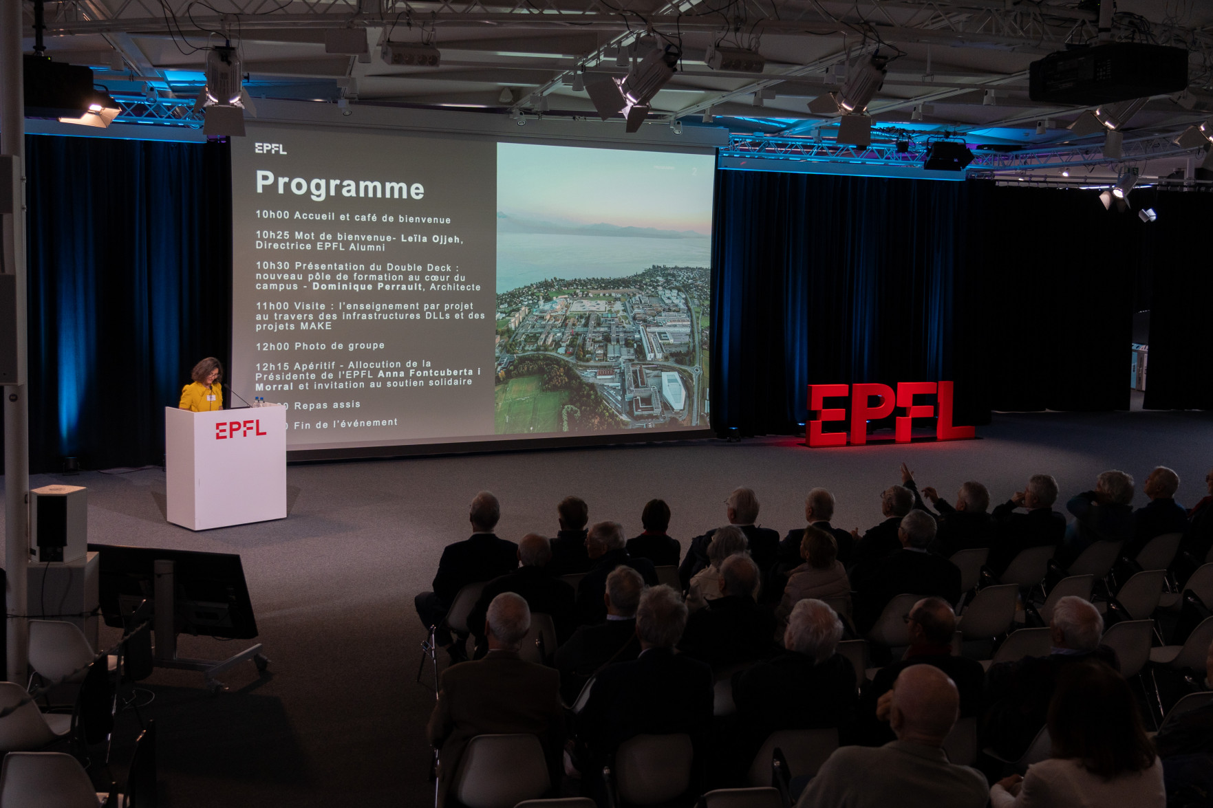 Le programme a débuté par un accueil de Leïla Ojjeh, directrice d'EPFL Alumni, ainsi qu'une présentation du Double Deck, nouveau pôle de formation qui verra le jour en 2027, présenté par son créateur, l'architecte Dominique Perrault. Les participantes et participants ont par la suite pu visiter les Discovery Learning Labs et découvrir l'univers des projets MAKE, ces projets interdisciplinaires menés par le corps étudiant. La matinée s'est conclue par l'incontournable photo de groupe devant le logo de l'Ecole.