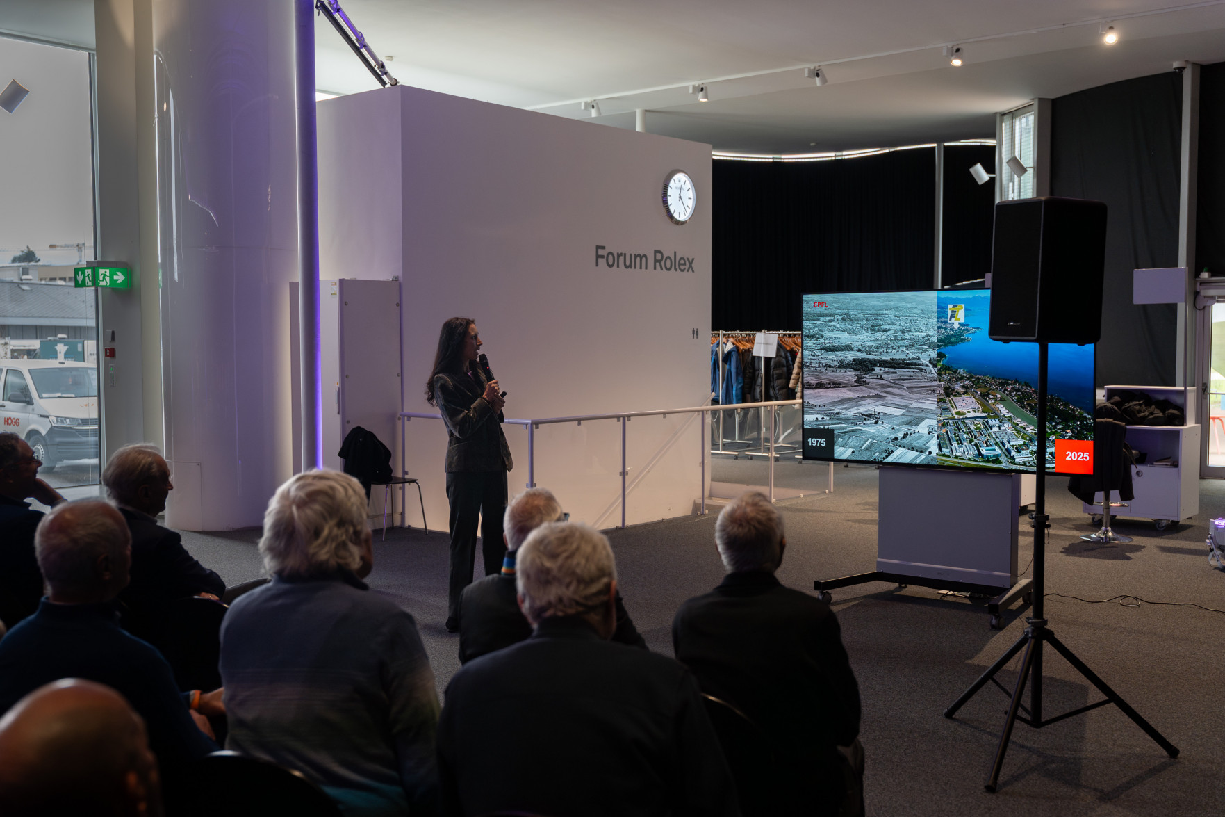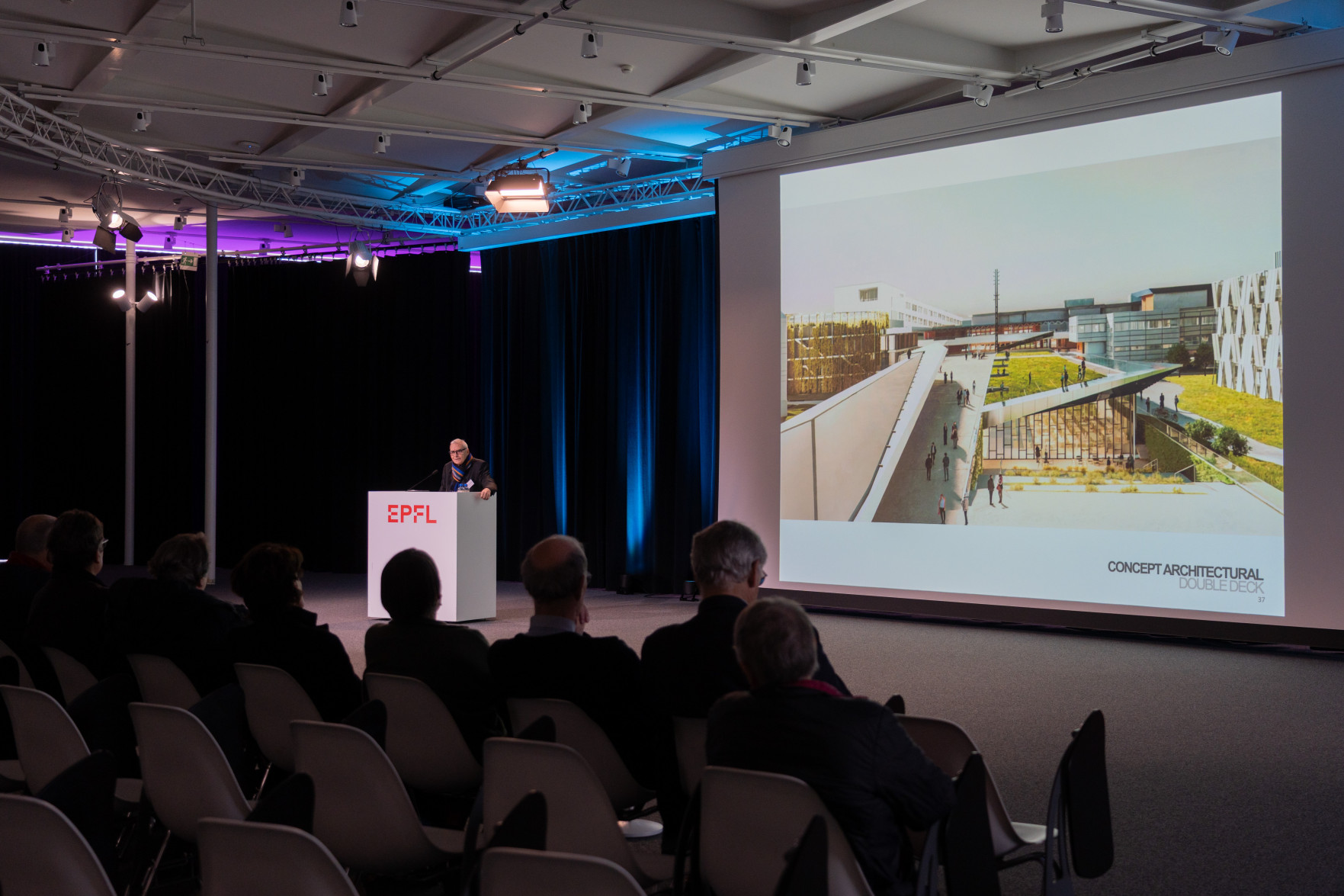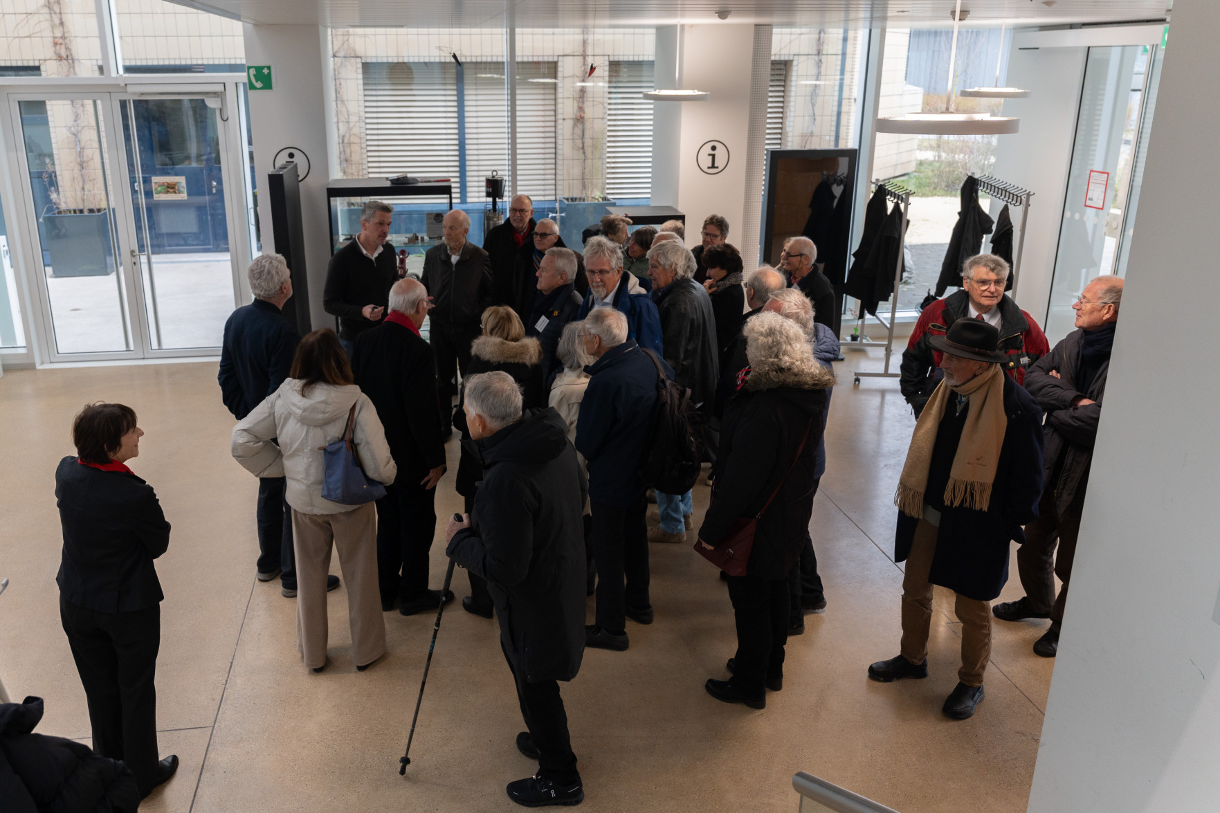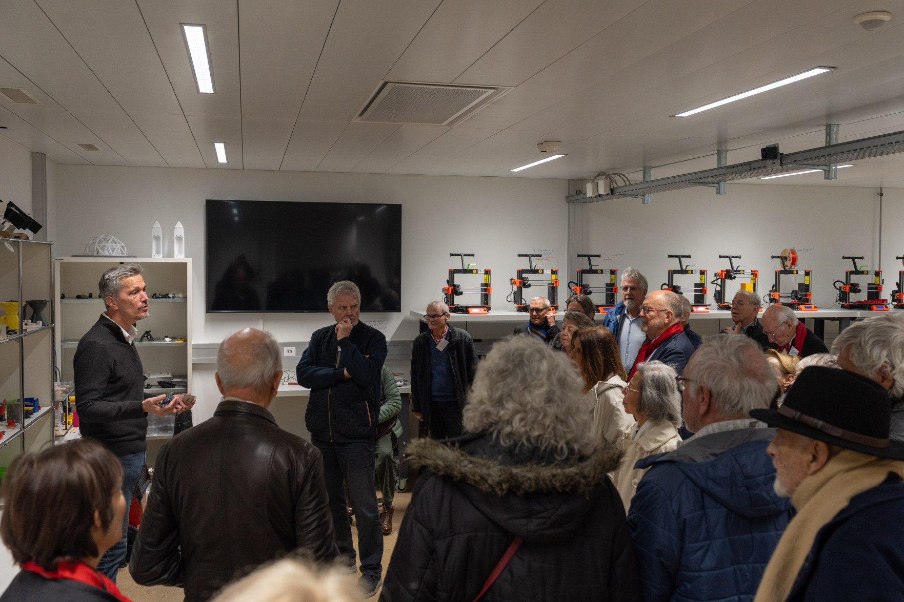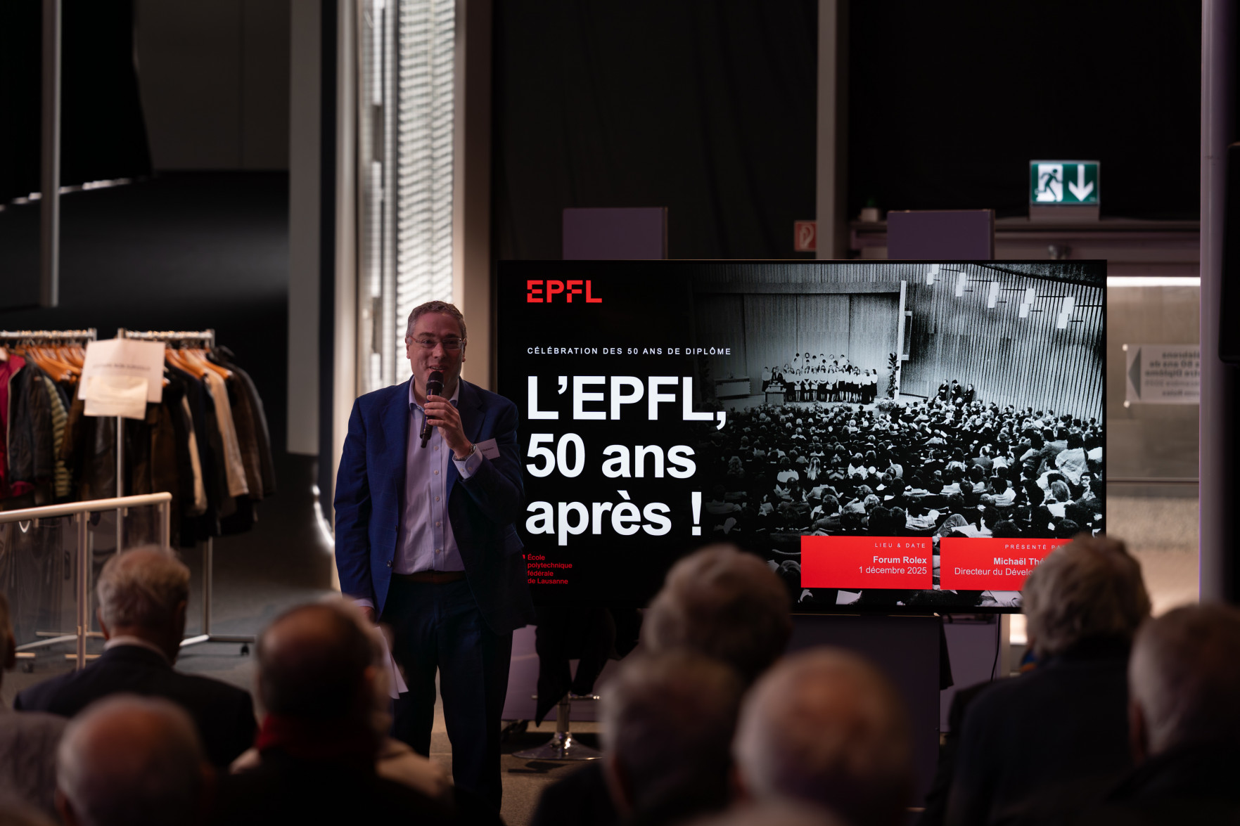 Le programme a débuté par un accueil de Leïla Ojjeh, directrice d'EPFL Alumni, ainsi qu'une présentation du Double Deck, nouveau pôle de formation qui verra le jour en 2027, présenté par son créateur, l'architecte Dominique Perrault. Les participantes et participants ont par la suite pu visiter les Discovery Learning Labs et découvrir l'univers des projets MAKE, ces projets interdisciplinaires menés par le corps étudiant. La matinée s'est conclue par l'incontournable photo de groupe devant le logo de l'Ecole.